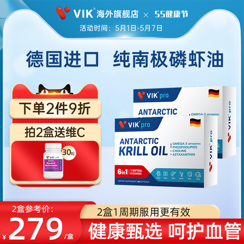 德国进口南极磷虾油,专利提纯技术,近99%有效成分,一粒相当于普通鱼油3-4粒,科学配方,磷虾油VS鱼油,近6倍吸收,呵护血管,呵护全身健康!德国VIKpro进口高端纯南极磷虾油56%海洋磷脂鱼油升级omega3胶囊保健食品/膳食营养补充食品